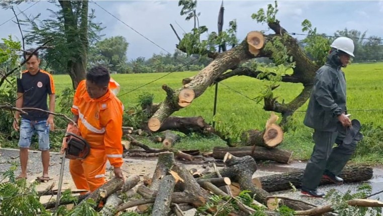 Sementara itu, proses pembersihan pohon tumbang dilakukan menggunakan chainsaw dan alat manual.