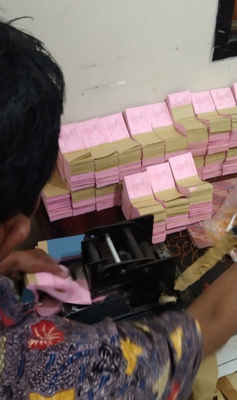Petugas melakukan proses pencetakan dan perporasi karcis retribusi sebelum didistribusikan ke OPD.