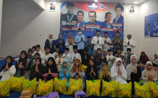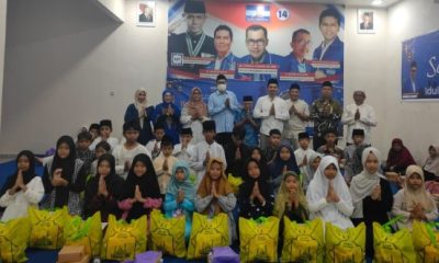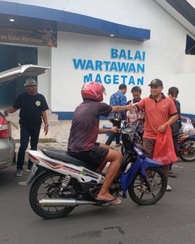 Crew Suarakumandang.com dibantu para santri pondok di Magetan membagikan takjil kepada pengendara dan warga yang melintas di depan Masjid Agung Baitusalam, Minggu (8/3/2026). Kegiatan berbagi ini...