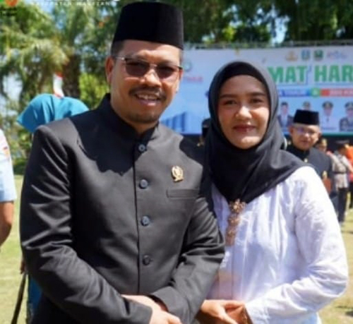 Ketua DPRD Magetan Suratno didampingi istrinya usai Upacara Peringatan Hari Jadi ke-350 Kabupaten Magetan dan ke-80 Provinsi Jawa Timur di Alun-Alun Magetan, Minggu (12/10/2025).