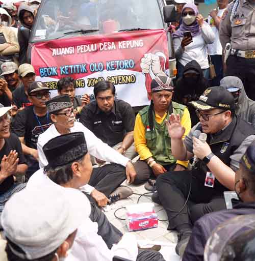 Hanya dengan duduk lesehan Mas Dhito mencoba mendengar aspirasi warga. Dalam tuntutannya, warga menginginkan Kepala Desa Kepung untuk turun dari jabatannya karena dianggap tidak transparan dalam menggunakan anggaran desa.